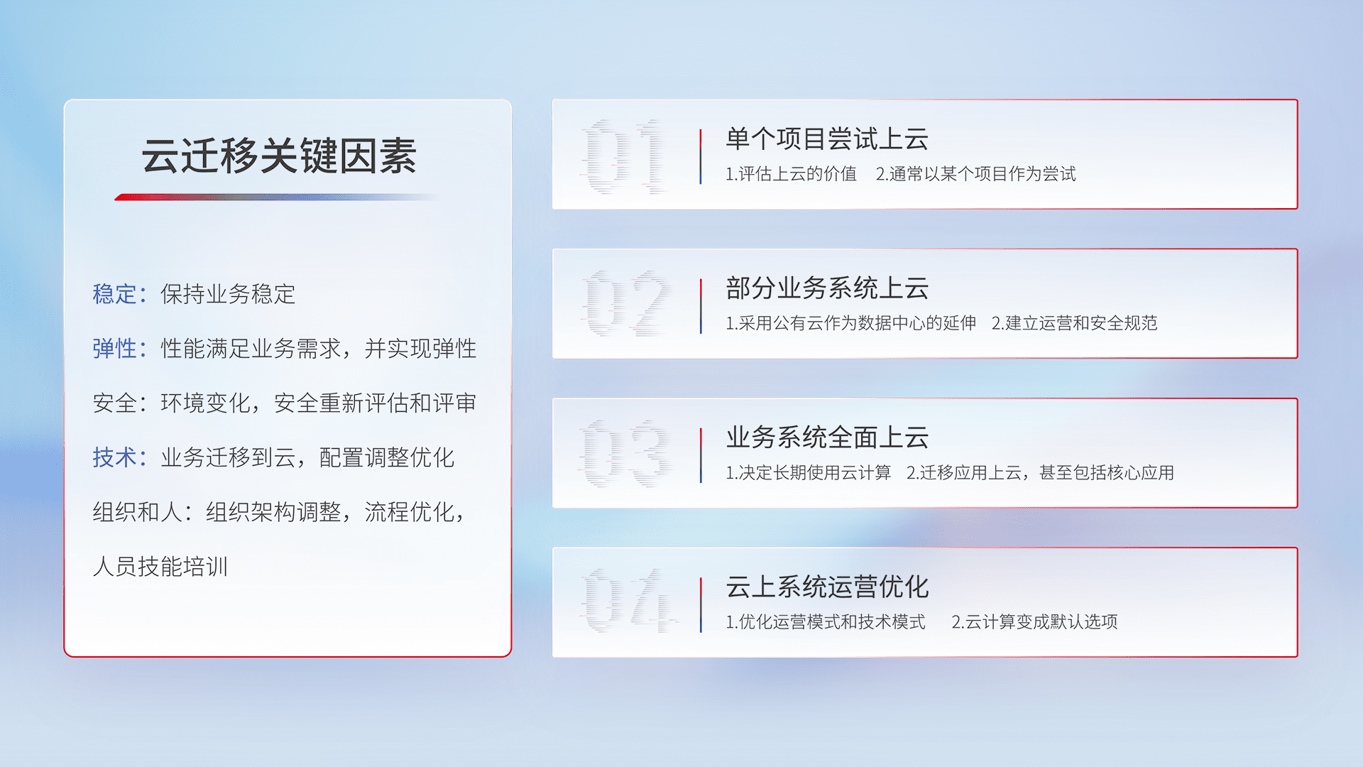 结合实际业务,,,从规划设计、、、、云平台选型、、、云原生改造、、、、数据迁移、、集成交付,,迁移全过程为客户识别最佳上云路径,,,做好风险识别管理,,,,设计网络架构、、、、身份权限、、、、安全审计合规、、操作审计、、、日志审计、、、、监控告警策略、、多站点容灾设计等,,,对云上基础设施进行整体规划,,,提升IT治理水平,,,以满足弹性、、高可用、、高性能的需求。。。