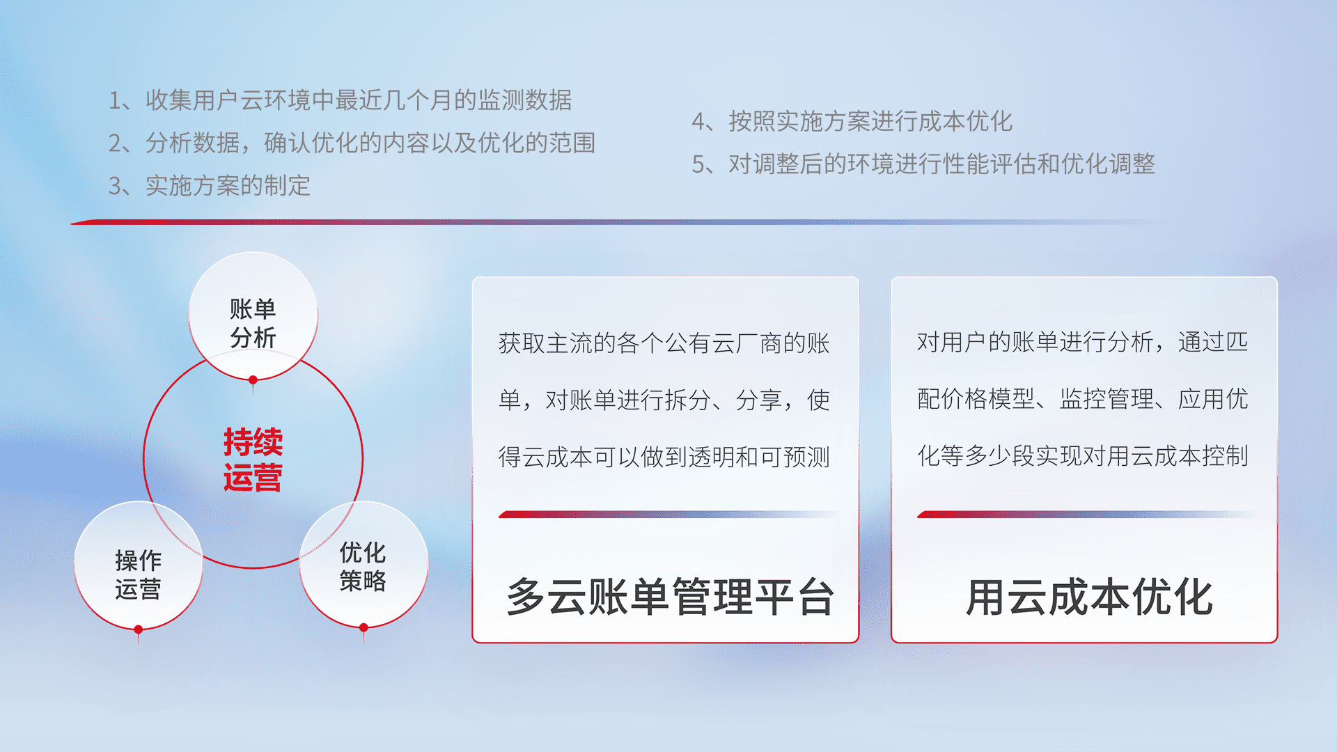 通过多云纳管,,,以统一的资源数据模型把客户的云资源进行抽象和封装,,,进而实现对多云资源的统一操作,,保障云资源管理的可靠性、、稳定性与可用性。。。。量身定制化运维内容,,配置、、、、开发运维、、、补丁管理、、、、备份、、监控、、、、认证和访问管理、、、、审计和日常巡检等,,,保障在用云过程中的可靠度,,稳定度以及高可用率。。